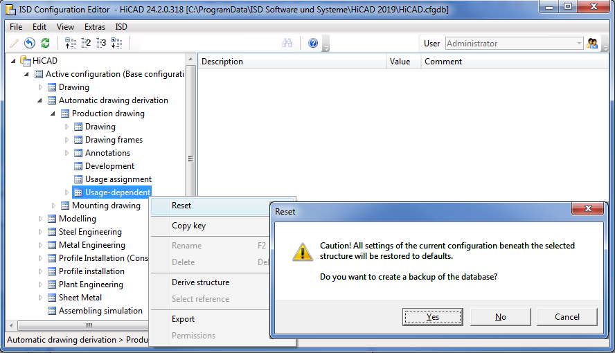 For instance, if you have modified the default settings of the dimensioning rules in various directories, you can right-click the Usage-dependent entry, choose Reset, and, after confirming the security prompt with, restore the modified settings to defaults again. If you confirm with Yes, a backup ([Installation directory] > Configuration > HiCAD.cfgdb.[Date]) will be created, in case you may require the modified settings later again. If you choose No, the values will be reset without creating a backup.