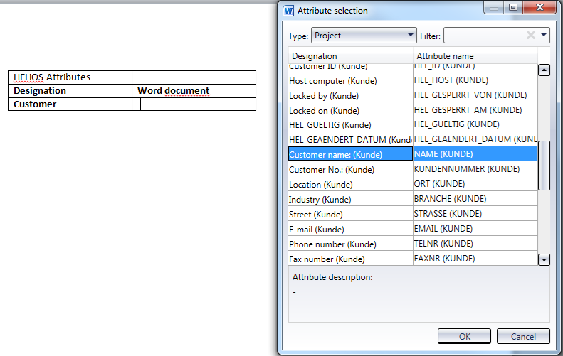 New to assign further fields to your active Word or Excel document. The Attribute selection dialogue window will be displayed: