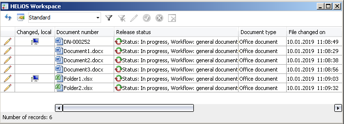 In the Changed, local column the symbol indicates that a document has been changed locally and saved since its last synchronization with HELiOS.