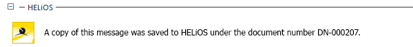 If an E-mail has been saved in HELiOS in this way, you will find a note with the HELiOS document number at the bottom of the E-mail in Outlook.