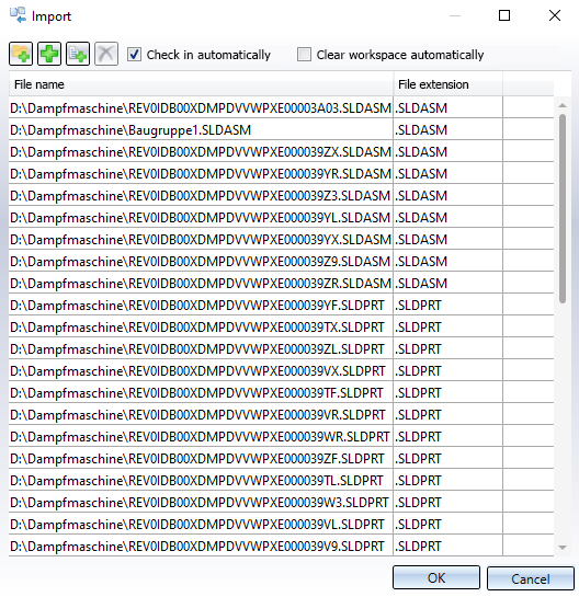 With the Clear workspace automatically checkbox you can control whether the affected files should be removed directly from the workspace after the batch import has been performed. This option may be useful if repeated loading of the same parts into the workspace affects the general performance. Documents which are already in the workspace at the time of import are not affected by the emptying procedure.