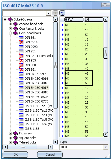 Let us assume that you require hexagon head bolt according to DIN EN ISO 4017 with the dimensions M 6x100 (Material 10.9). The fact that these are not available in the table is not a bug, but due to ISD's compliance with certain standards. You can however use the Catalogue Editor to add bolts and screws with other dimensions to the table.