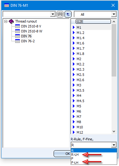 In the table DIN 76 at Processings, general > Processing > Thread runout you can now also find left-handed threads (Type F-LH and R-LH).