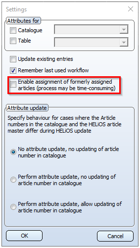 If you have cancelled the assignments between catalogue entries and HELiOS article masters and would like to restore them when transferring them again, you only have to activate the checkbox Enable assignment of formerly assigned articles in the Settings.