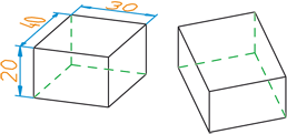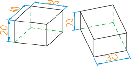 The figure below shows two different views of a cuboid. The left-hand view, the active view, shows all dimensionings.