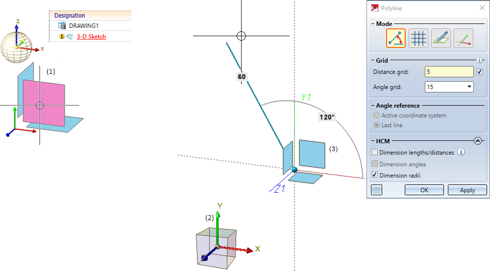 On axes In this mode you draw on the axes of the current coordinate system. In 3-D sketches, the layer preview is hidden. If the Grid checkbox at the bottom of the dialogue window is active, then grid points are displayed on the axes of the coordinate system as construction aids. |