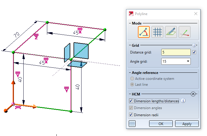 - To complete your polyline, click either OK or Apply in the dialogue. Selecting OK closes the dialogue window. If Apply is selected, the dialogue remains open, allowing you to draw further polylines (of the same sketch)..