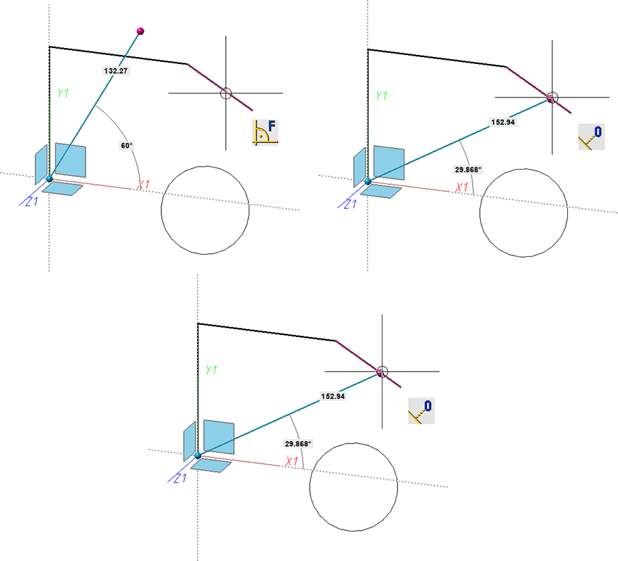 With this function you can change the direction in which the next line is to be drawn. To do this, specify the direction vector by defining two points, by selecting a straight line or by selecting a surface. If a surface is selected, then the direction is determined by the surface normal. |