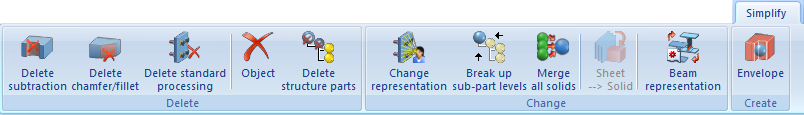 This Ribbon tab contains all functions that enable a simplification of complex 3-D models before passing them on to any third party. This makes sense in case of very large layouts the processing of which would be too slow, or when you want to provide partners or customers only with those information that they really need.