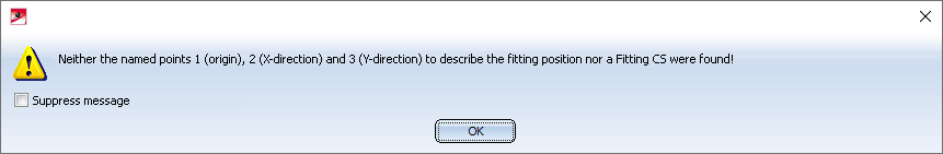 Purchased/factory standard parts and moulding tools are also placed in the model drawing via the Fitting CS of the corresponding KRA file or via three isolated and named points defined in the KRA file (Point 1 for the origin, Point 2 for the X-direction, Point 3 for the Y-direction). If neither these points nor a Fitting CS are defined, the following message appears from HiCAD 2021 onwards: