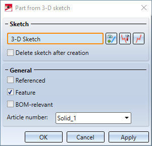 If it is possible to create a solid on the basis of the selected 3-D sketch, then a preview of the part is automatically displayed in the design. With a click on the Apply button (or on OK or by pressing the middle mouse button) the part is created.