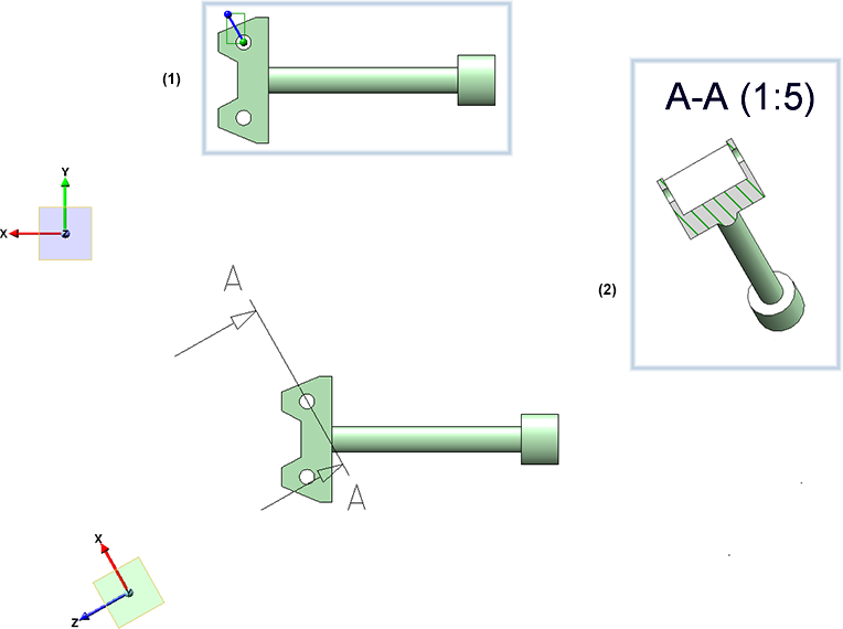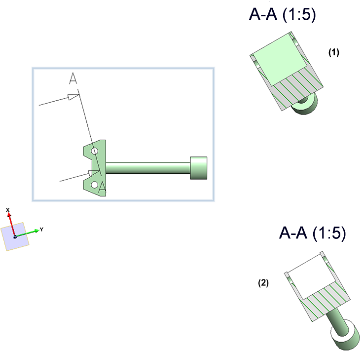 The image shows the original view with the sketch for the section path (1) and the generated sectional view (2).