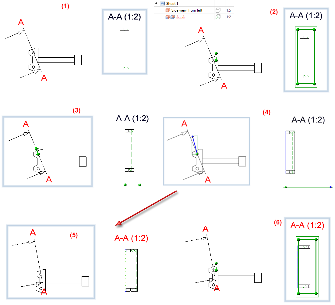 If the viewing direction in sectional views is perpendicular to the leading cut plane, then it will be tracked from SP1 onwards when the section path is changed manually, i.e. it will also be perpendicular to the cut plane after the change. This is especially important for variable-controlled models.