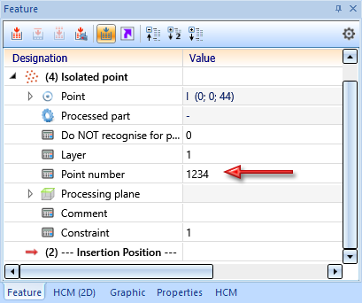 Previously, when assigning a point number to an isolated point, a feature called Assign point number was entered into the feature log of the corresponding part - at the same level as the Isolated point feature. This behaviour has changed with SP1. When creating an isolated point, the feature parameter Point number is now always entered into the feature Isolated point. If a point number is assigned, then the parameter value is adjusted accordingly. Due to this new behaviour, the deletion of point numbers is now also taken into account during feature recalculation.
