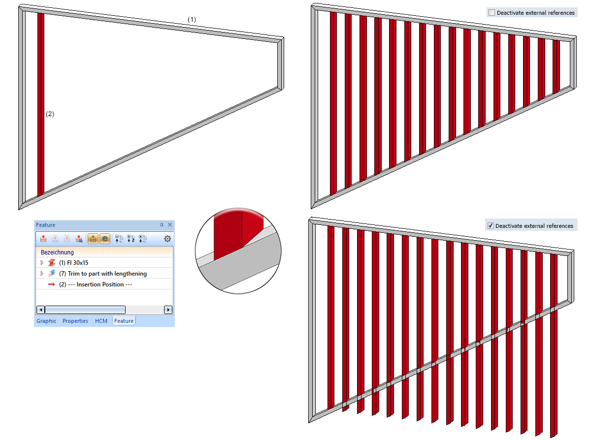 The image below shows a framework (1) with a trimmed filling rod (2) on the left. This filling rod is to be cloned (copied) by linear repetition in such a way that the framework is evenly filled with trimmed filling rods. Due to the cut, there is an external reference between the filling rod (2) and the lower framework beam. On the right you can see the result with and without the use of external references.