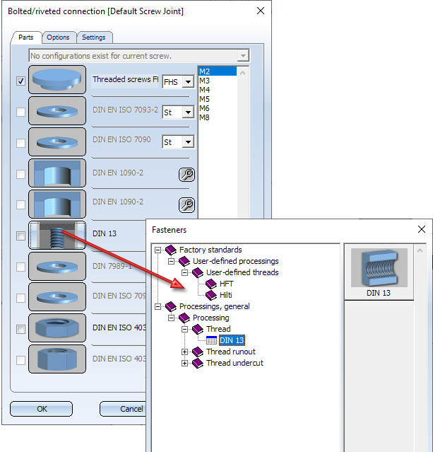 From SP1 onwards, user-defined threads can be selected from the catalogue Factory standards > User-defined processings > User-defined threads - depending on the selected screw/bolt type - when inserting boltings in your model drawing.