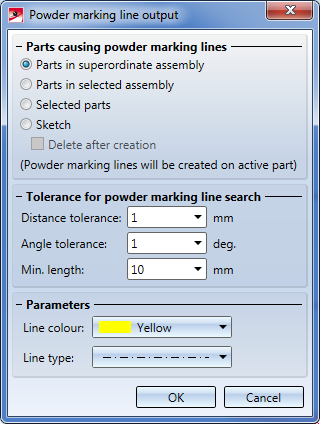 Applies to the active part. After closing the dialogue window, HiCAD will prompt you to identify the parts causing the powder marking lines.