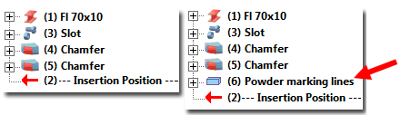 For each powder marking line search, a feature called Powder marking lines will be created for the feature log of the part onto which the lines have been projected. If you have selected the Selected parts mode, such an entry will be created for each identified, attached part (provided that any powder marking lines exist).