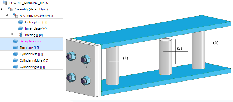 In the example below the Base plate and the Top plate have been selected before calling the function. In the Selected parts mode, the Cylinders (1) , (2) and (3) have then been selected.