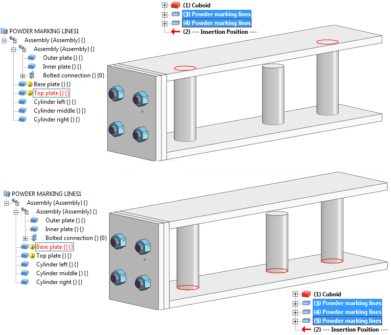 HiCAD will then automatically detect the powder marking lines caused by the cylinders on the base plate and the top plate.