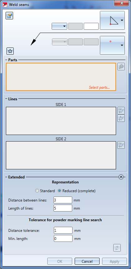 You can select between the standard representation (Mechanical Engineering) and the special, simplified representation (Steel Engineering). Furthermore, you can specify the lengths of the lines, and the distance between and them for weld seam representation.