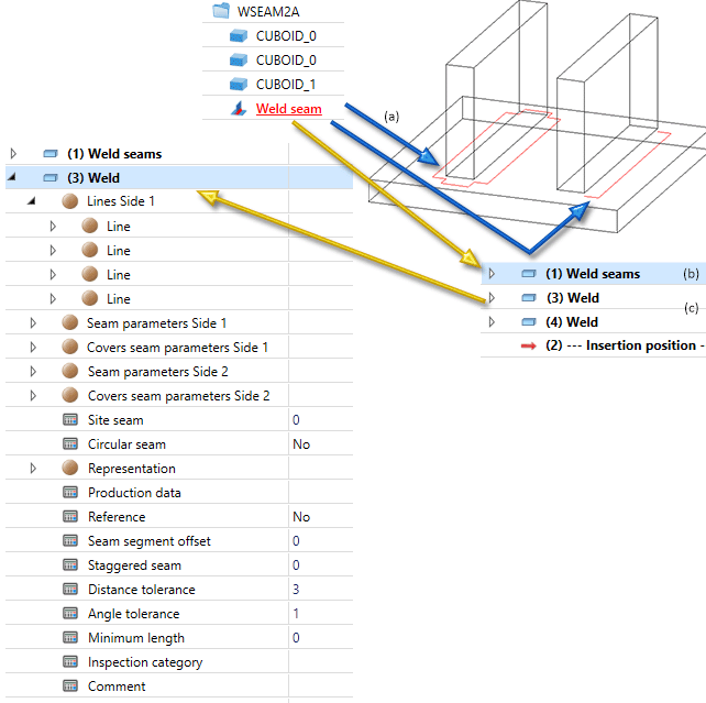 In the example shown below, the two weld seams on the left hand side were created in one step. In the process, the main part Weld seam (a) was created. After this, the weld seam function was called again (while the main part was still active) and the right weld seam was created. The feature log then contains the creation feature (b) and two weld seam features (c). In our example, feature (3) belongs to the two first created weld seams (for this reason there are four entries under Welding line list).