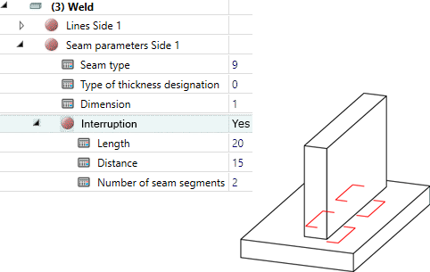 - If you want to split the weld seam into seam segments, set in the feature log, under Parameters of main seam, the Interruption entry to Yes and enter the length, the distance and the number of segments.