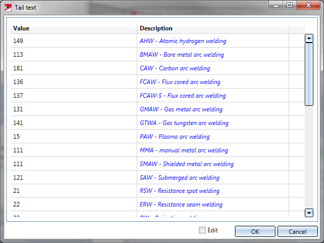 icon to copy texts from your Favourites. You can then edit texts that have been saved as Favourites. Several tail texts have been predefined by the ISD in the Configuration Editor, at Modelling > Weld seams > Dialogue.