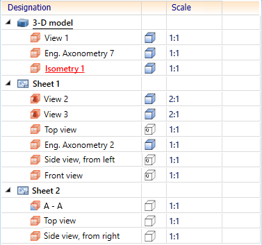 An overview of all views of a model drawing - separated according to model views and sheet views - are shown in the Views window of the ICN. Model views are listed there under 3-D model, sheet views under the various sheet areas, e.g. Sheet 1, Sheet 2, etc.