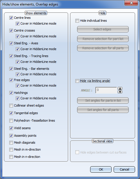 Especially when displaying polyhedrons and freeform surfaces, certain edges that conflict with the rules of technical drawing need to be hidden. Edges are therefore assigned an internal ID, which identifies them as a normal or tangential edge, mesh edge in m-direction, n-direction, mesh diagonal or polyhedral lateral edge. m and n here are the natural parameter directions of a surface, e.g. latitude and longitude of a sphere. Furthermore, edges can also be hidden using the limiting angle or by means of individual identification. The various options are made available in a window. ID, limiting angle and edge identification are treated equally (OR link).