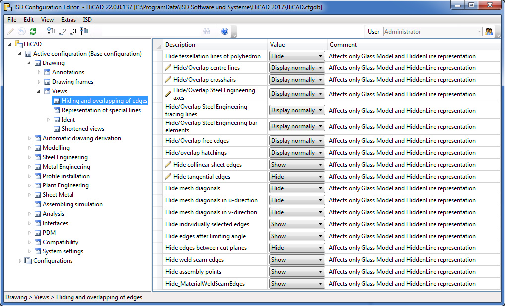 The presettings for this dialogue window can be changed in the Configuration Editor, at Drawing > Views > Hiding and overlapping of edges.