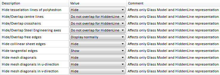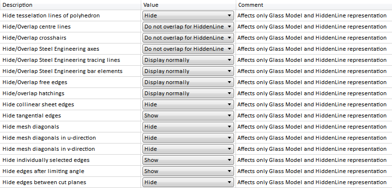 Here you can specify the presettings for the Show/hide elements in view function. Please note that the settings only apply for the Glass Model and the HiddenLine representation.