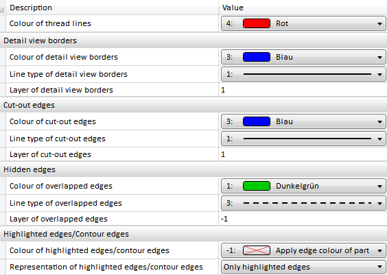 Here you can specify the representation (colour, line type, layer) of