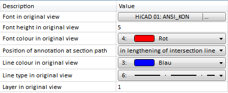 At Sections you specify the representation of the section path and the identification of the section in the original view. You can select the font, its height and colour, the position of the annotation at the section path, and the line colour, the line type and the layer in the original view.