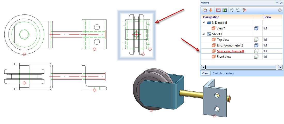 - in the drawing sheets (sheet views) by a coloured, wider view frame.