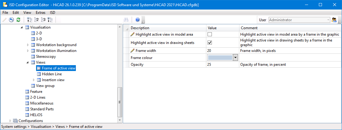 The frame display of the active view - colour, line width and transparency of the frame - can be preset in the Configuration Editor at System settings > Visualisation > Views > Frame of active view. You determine the colour by specifying the RGB values. There you can also determine whether the active view in the Model area and on the drawing sheets (sheet views) is to be highlighted or not. The image below shows the ISD default settings.