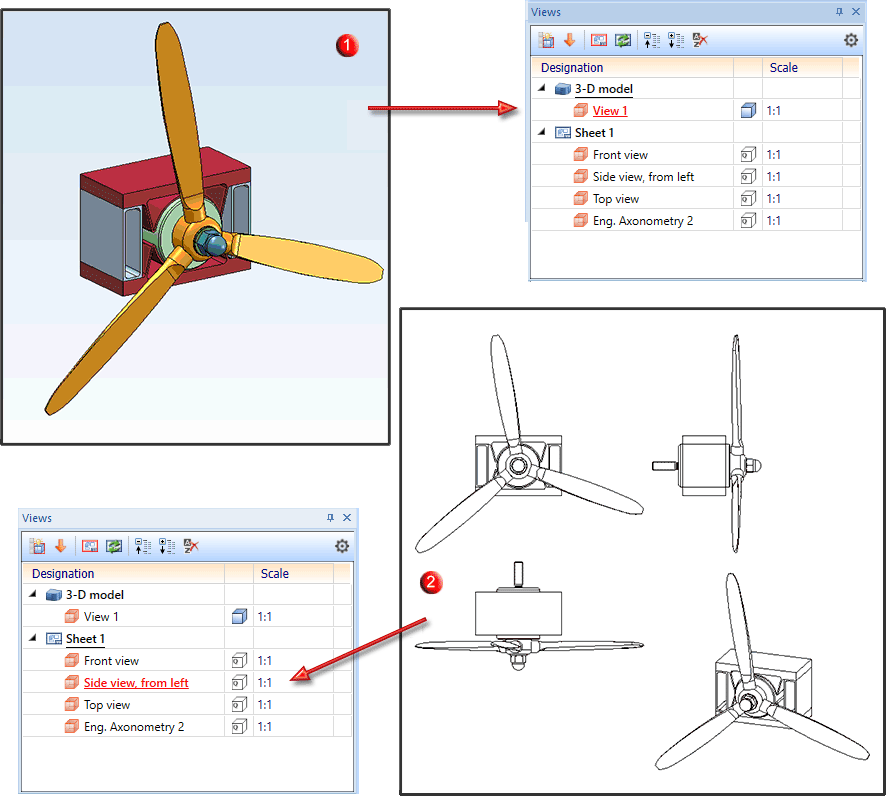 Model views are genuine 3-D views, e.g. any detail and sectional views, cut-outs in any depth and direction, list views with particular assemblies or parts and so on. This does not alter the position of the views in the sheet area.