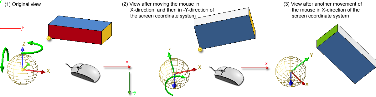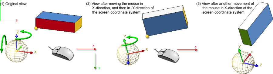 As in a), the original view (1) was rotated about the Z-axis and tilted in relation to the screen horizontal by moving the mouse in X-direction, and then in Y-direction. If in the current view (2) the Rotate view dynamically about 3-D point function is called again, the rotation axis will be the Y-axis, as it is now the axis with the greatest rise. If you now move the mouse in X-direction again, this will cause a rotation about the Y-axis (3).