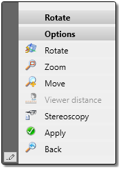 Activates the context menu. You can rotate, zoom or move the view, restore the original view, or apply the current view. If the active view contains a central projection, you can also change the viewer distance.