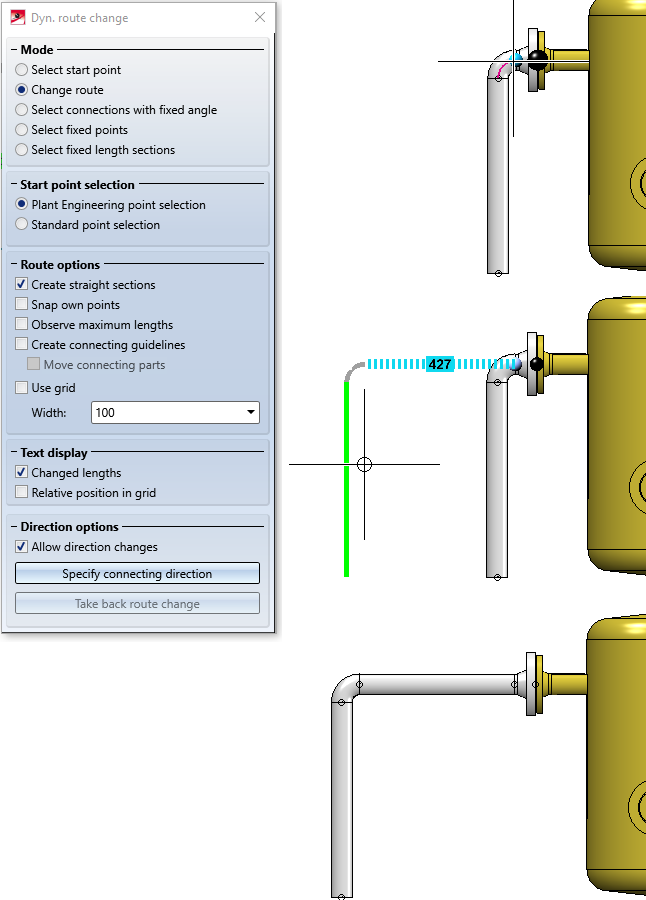 A route change also allows the creation of new straight sections. For this the Create straight sections checkbox must be active. A typical use case is the increase of the distance between two parts, such as the illustrated elbow and the flange.