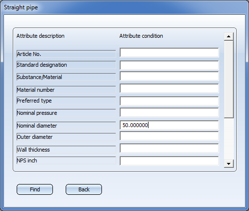 For the attributes for which you want to set a search condition, enter the desired condition in the column on the right hand side of the window. For instance, if you enter the condition DIN 24* for Standard designation, only data records beginning with DIN 24 will be taken into account for the search.