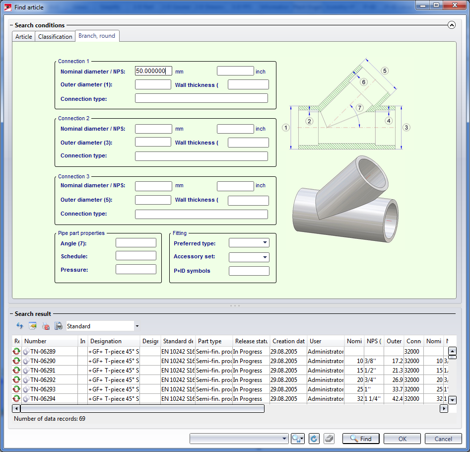 If you have chosen Parts from: Database on the Part selection tab of the Plant Engineering Settings dialogue window, part search and part selection will be carried out via the HELiOS user interface. After selecting the part type, the corresponding mask for Plant Engineering classification will be displayed - with a 3-D image and a sectional view of the chosen part type.