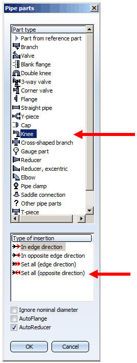 Like Elbows, you can also place parts of the type Knee onto individual or, automatically, on all corners of a guideline. In contrast to the Elbows, these parts do not necessarily need to be symmetrical. Therefore you can select the insertion direction here.
