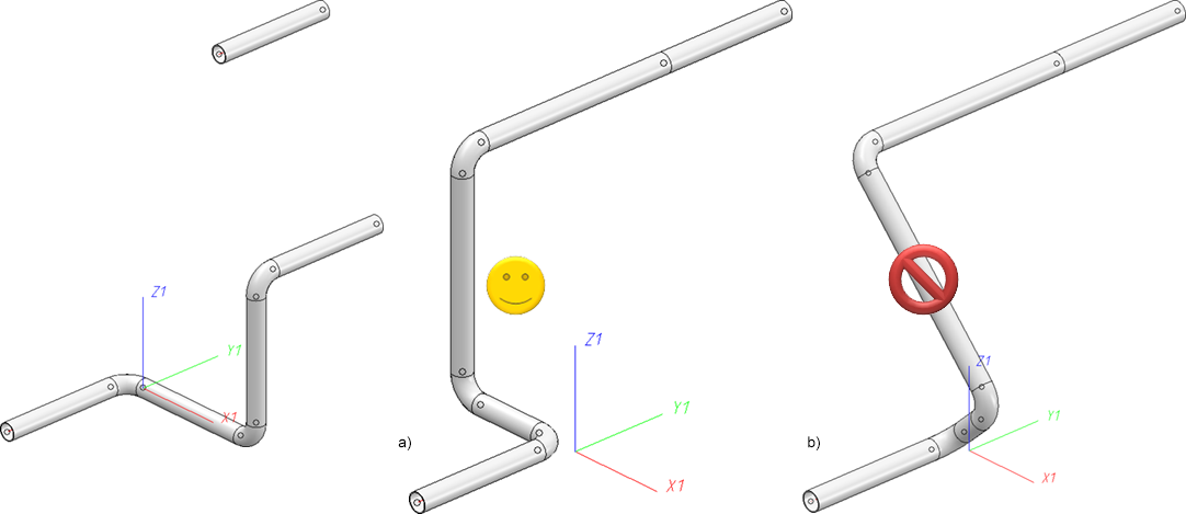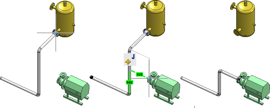 The dynamic route change will a) be suggested to you. To obtain b) you need to make all connections "rigid" by activating the Select connections with fixed angles option, except for the one of the leftmost, straight pipe.