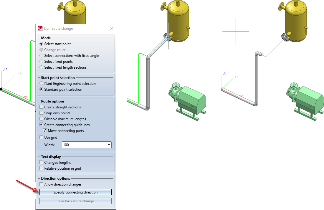 By default, the connecting direction of Plant Engineering connecting points are used in such a way that the orientation of the pipeline can be changed. If you deactivate the Allow direction changes option in the context menu, no direction changes will be possible any more.
