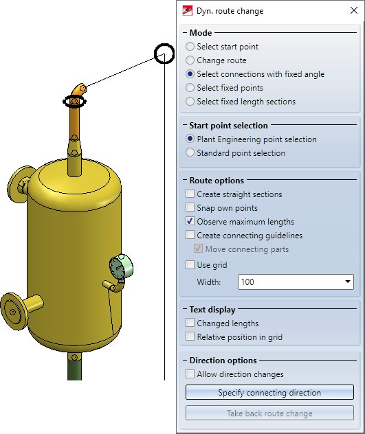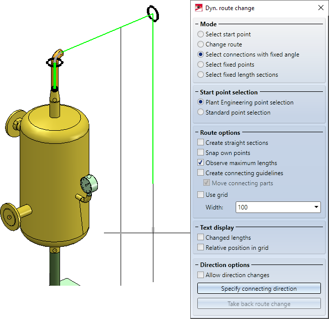 The Change route function also allows a changing of angles. The connections of the pipeline parts are regarded as possible rotation axes in the process.