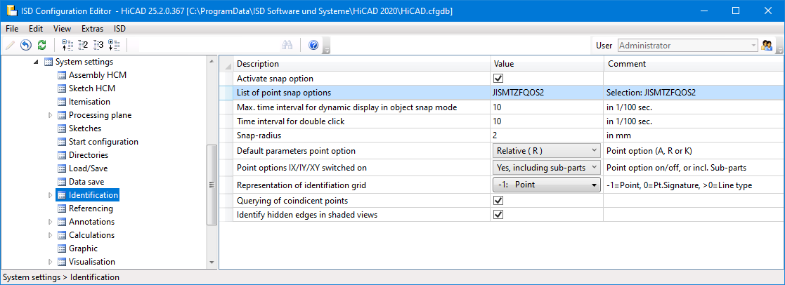 To define the size of the snap radius, open the Configuration Editor (ISDConfigEditor.exe) and select ... > System settings > Identification > Snap radius (Default = 2 mm).