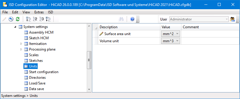 The ISD default setting for surface areas is square metres, for volume Active unit, i.e. cubic millimetres).