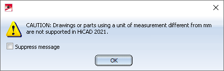 HiCAD 2021 only supports parts and drawings with the unit of measurement mm. If you try to open drawings with a different unit of measurement or insert parts with a unit of measurement different from mm, an error message is displayed: