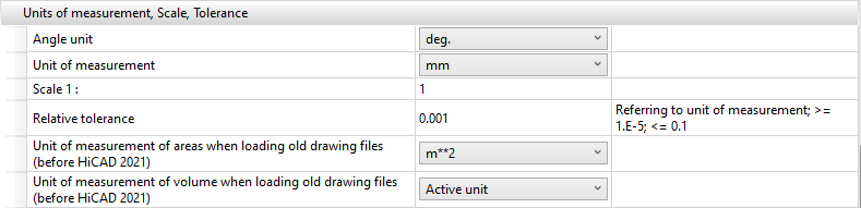 Usually these settings will match the settings in System settings > Units. This means that you do not need to change anything when loading model drawings from previous HiCAD versions.